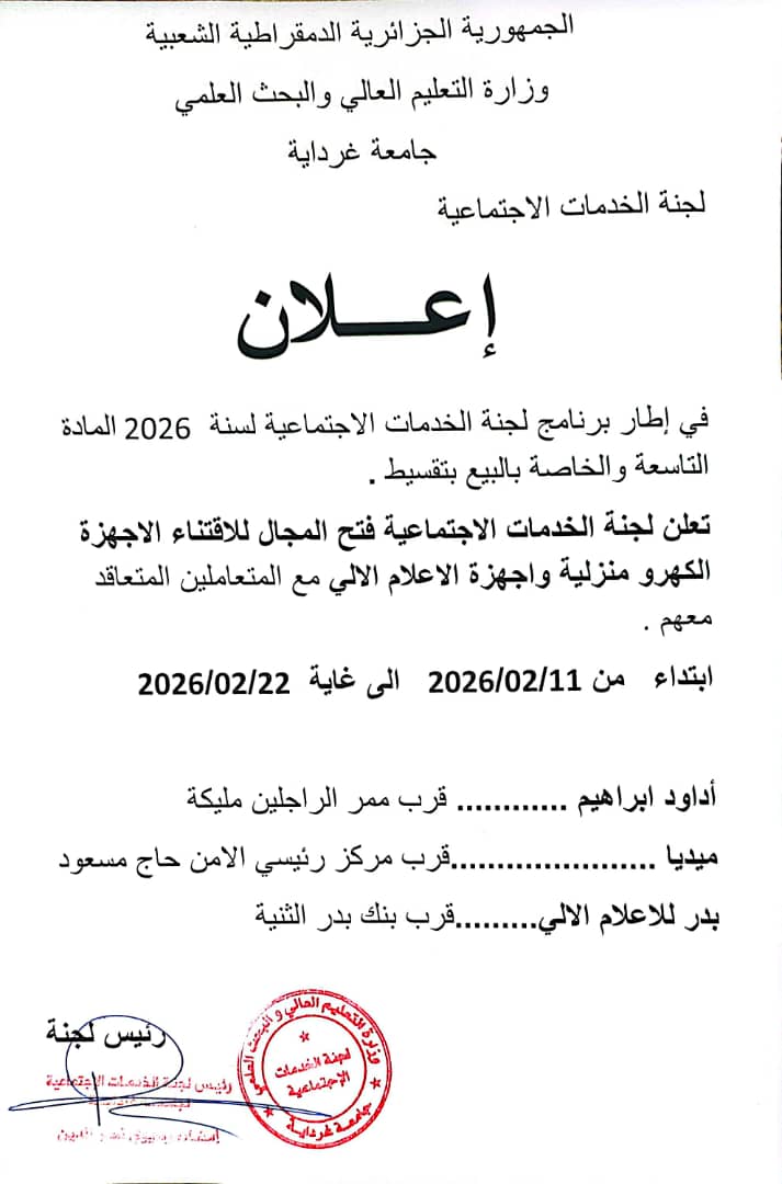تعلن لجنة الخدمات الاجتماعية لجامعة غرداية عن البيع بالتقسيط