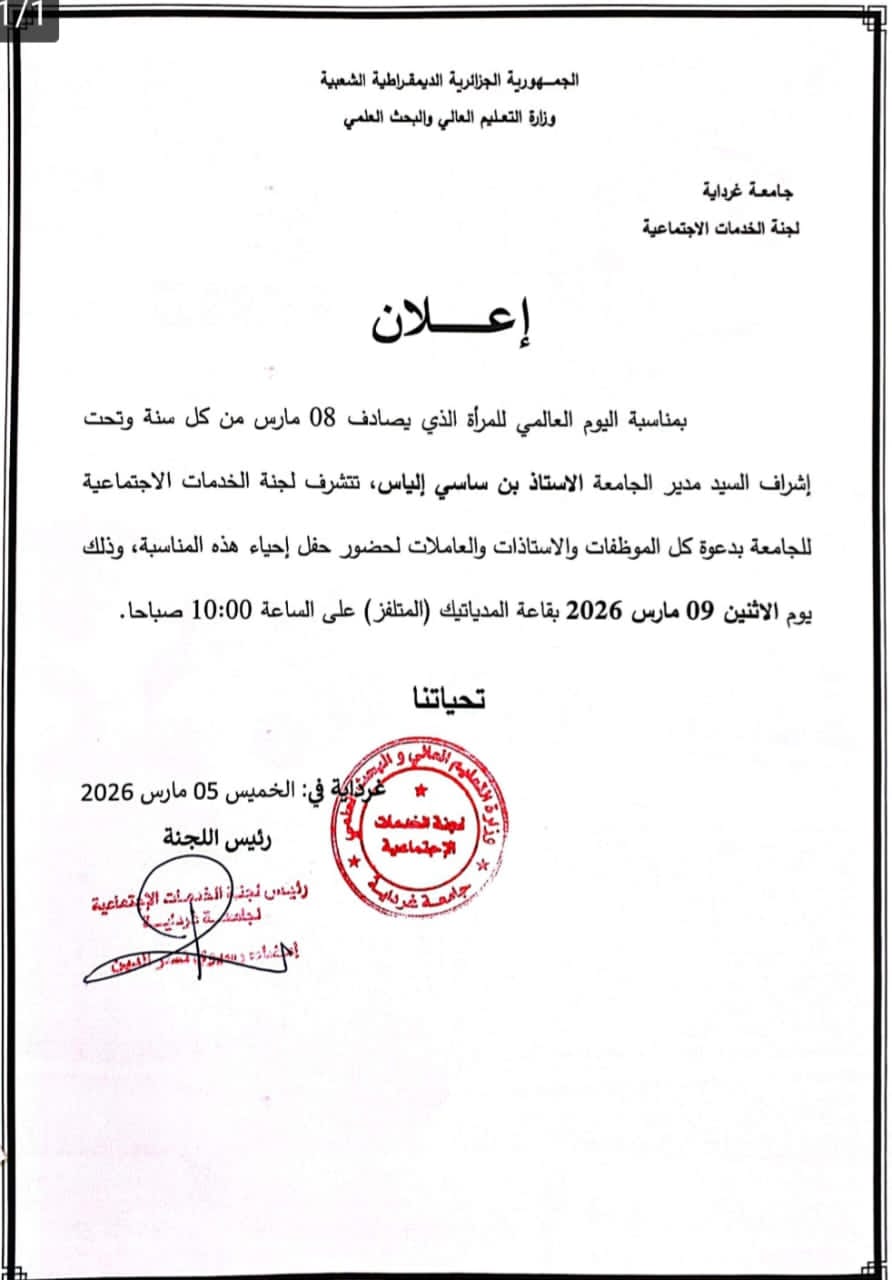 بمناسبة اليوم العالمي للمرأة المصادف ل 8 مارس من كل سنة تحت إشراف السيد مدير الجامعة الأستاذ بن ساسي إلياس و لجنة الخدمات الاجتماعية لجامعة غرداية تدعوكم