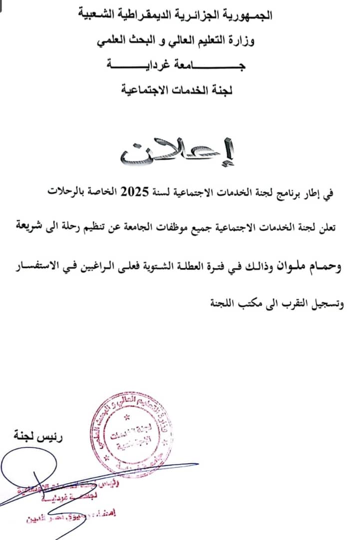 تعلن لجنة الخدمات الاجتماعية بجامعة غرداية عن تنظيم رحلات IMG-20251125-WA0001تنزيل IMG-20251125-WA0000تنزيل